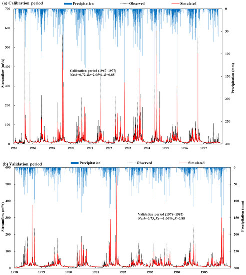 Comparison between the observed and simulated daily streamflow of the Dabai hydrological station during (a) the calibration and (b) validation periods.