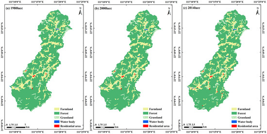Map of land use/cover change (LUCC) in the Caojiang River Basin (CRB) in (a) 1980, (b) 2000, and (c) 2014.