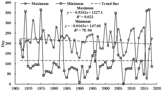 Temporal variations in the occurrence dates of Amax and Amin at the Daibai hydrological station from 1967–2018.