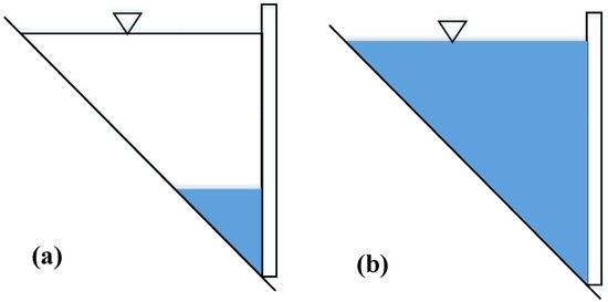 Sketch of the storage and discharge rules of small reservoirs (ponds), (a) is before the flood season, (b) is after the flood season, inverted triangle is the normal water level for storage.