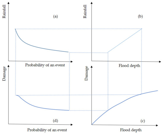 Expected Annual Damages estimation approach. (a) Relationship between annual exceedance probability and rainfall depth; (b) Relationship between rainfall level and flood depth; (c) Depth–damage curves; (d) Damage–probability curve.