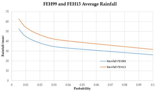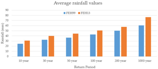 In the FEH99 hazard data, up to 10% of the residential properties and 7% of the non-residential properties within the catchment are directly exposed to pluvial flooding, with the majority of flooded properties located in the urban centre. The catchment was divided into 14 rainfall grid cells of 5 km by 5 km, which average the underlying 1 km resolution FEH 3 h storm duration rainfall datasets, as there is little spatial variability in rainfall over these distances. In Perth, the average increase in total rainfall depths between FEH99 and FEH13 datasets for comparable return periods and storm durations is 21% (Figure 5), with generally larger rainfall depths occurring more frequently within the revised dataset. The FEH13 rainfall values for a given return period are generally equivalent to the FEH99 rainfall values of a lower frequency return period up to the 200-year return period, as shown in earlier studies [10]. For example, the 3 h duration rainfall depth for the FEH99 30-year return period is 32.3 mm; in FEH13, a rainfall depth of 31.5 mm occurs at the 10-year return period for the same event duration. The greatest change in frequency is for the FEH99 100-year return period where the rainfall value is now close to the FEH13 50-year return period. Given this, it is expected that an increase in annual average damages will occur due to the change in frequency of larger rainfall events and, accordingly, an increase in exposure, i.e., properties not previously flooded at any return period are now flooded at low-frequency return periods.