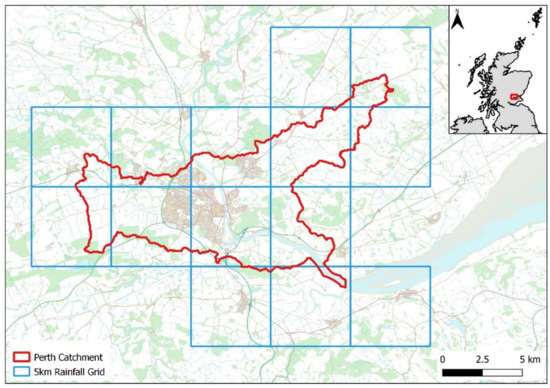 We apply the method to the Perth catchment in Scotland (Figure 4). This catchment is chosen as detailed 2D hydraulic modelling using the FEH13 rainfall estimates has already been undertaken [15]; therefore, we can validate our interpolation method. The validation is constrained by the availability of new modelling data.