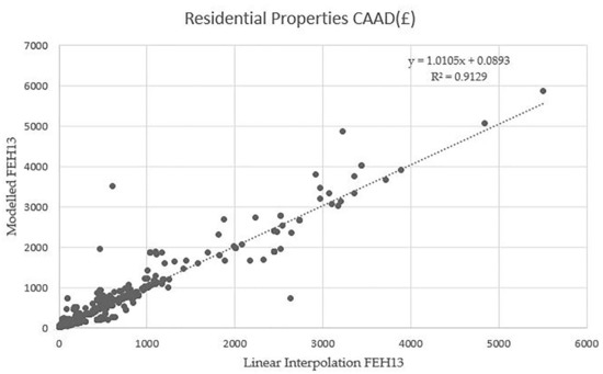 Table 3 shows comparable results for the CAAD calculations between those derived from modelled FEH13 hazard data and those from linear interpolation (combined outcomes) with an increase of 60% and 61%, respectively, compared to FEH99 CAAD values. The linear interpolation method slightly underestimates the CAAD in comparison to those derived from modelled FEH13 data. The linear interpolation underestimates the average CAAD per property by GBP 12. However, a large positive linear association (R2 = 0.91) with a slope coefficient of 1.01 is obtained between the linear interpolation method and the modelled FEH13 CAAD values, confirming that the linear approach provides a good approximation of the FEH13 residential CAAD (Figure 6). In the majority of cases, the interpolated CAAD values are expected to be in the range of 0.6–1.2% of the modelled FEH13-derived CAAD values due to the relatively small differences in the depths of water associated with pluvial flooding.
