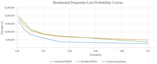 Interpolation techniques applied to flood loss probability curves at a meso-scale can provide an appropriate and simple approach to estimating such changes. The future flood explorer used in the UK Climate Change Risk Assessments is an example of the application of an interpolation approach where impact curves were produced for calculation areas and used to ‘look up’ impacts on risk metrics for any given return period [24,25].