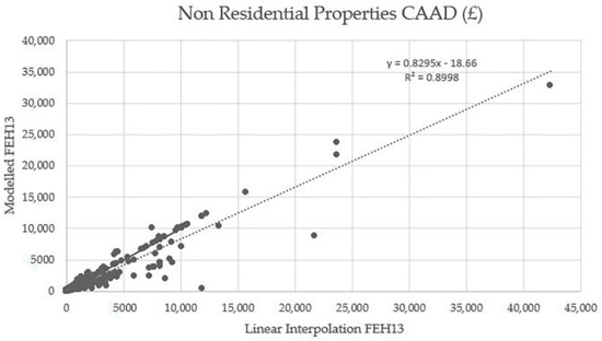 Table 5 shows less comparable results for the non-residential property CAAD calculations between those derived from modelled FEH13 hazard data and those from linear interpolation (combined outcomes) with, respectively, an increase of 43% and of 77% compared to FEH99 CAAD values. The linear interpolation method overestimates CAAD values in comparison to those derived from modelled FEH13 data; the overestimation in CAAD is larger for non-residential properties than those observed for residential properties. An overestimation is also seen for the average CAAD value. Overall, a large positive linear association (R2 = 0.89) with a slope coefficient of 0.83 is obtained between the linear interpolation method and the modelled FEH13 CAAD values for non-residential properties (Figure 8). This confirms that the linear approach provides a good approximation of the FEH13 non-residential CAAD. The greater differences in the estimates for non-residential properties compared to residential properties are mainly due to larger CAAD values and losses associated with certain non-residential property types. This is inherent to the non-residential property type, as potential losses vary significantly by flood depth band due to highly variable building footprints and as damages curves are calculated per square metre. For example, one of the outliers which overestimates the modelled FEH13 CAAD by GBP 13,000 is a public building with a large footprint (6271 m2). This single building contributes 5% of the overall difference. The property, with an associated flood loss of approximately GBP 320,000, is initially flooded at 100- (FEH99), 50- (FEH13) and at 30-year (linear interpolation) return periods, respectively.