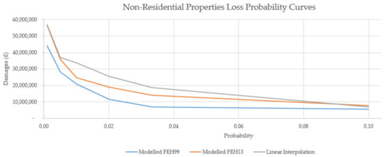 If the number of flooded properties per return period is considered (Table 6), the linear interpolation overestimates the number of flooded non-residential properties and a similar pattern to residential properties is observed. As with residential properties, the trend for an initial underestimation of the number of flooded properties at the 10-year return period is followed by an overestimation for subsequent return periods. The comparable numbers between modelled FEH99 and the linear interpolation for different return periods (e.g., 291 for 30-year and 100-year return periods) indicates that Equations (2) and (3) cannot precisely capture the rainfall depth at which flooding first occurs. This leads to higher estimates of loss per return period (Figure 9).