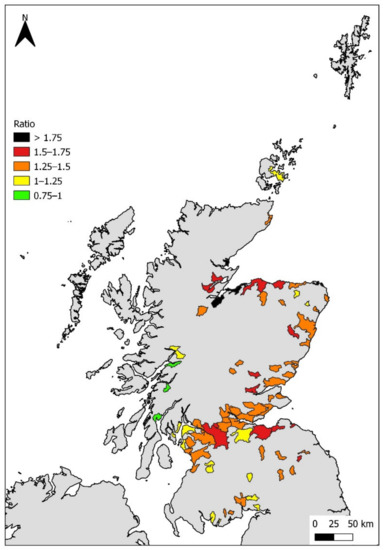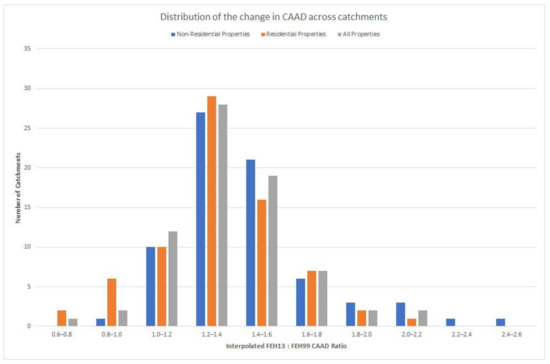 The ratio of change varies by catchment (Figure 10) with an average value of 1.37 and a standard deviation of 0.23. Some catchments on the west coast (Ballachulish, Taynuilt, and Lochgilphead) show a decrease in their total CAAD values, which can be related to a reduction in FEH13 rainfall estimates compared to FEH99 (Figure 11). Above average increases in total CAAD values are seen for some North East catchments such as Dornoch and Nairn, particularly for non-residential properties. Both sets of observations for significantly below and above average changes in CAAD values are consistent with expected changes in rainfall estimates between FEH99 and FEH13 DDF models for these locations [10].