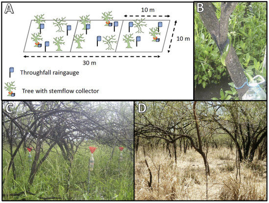 Details of the experimental setup used to investigate the interception and redistribution of precipitation in Parkinsonia aculeata stands at Palo Verde National Park, Costa Rica. (A) shows the plot design, (B) depicts the collar used to collect the stemflow, (C) shows the elevated rain gauges used to collect throughfall, and (D) provides a glimpse of the same plot during dry season.