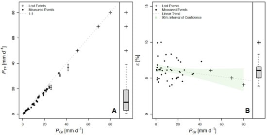 Linear relationship between throughfall and gross precipitation (A), and the distribution of the sampling error in percentage respect to gross precipitation (B) in a Parkinsonia aculeata stand at Palo Verde National Park, Costa Rica.