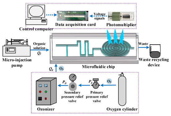 It is a relatively novel online monitoring technology—ozone chemiluminescence determination of COD in the waterbody. In other words, ozone dissolves in water and decomposes, resulting in a series of strong oxidizing active free radicals. The organic matter oxidizes in water and the characteristic of chemiluminescence is generated [14] to realize the determination of COD in the waterbody. However, ozone itself is difficult to dissolve in water and is easy to decompose into oxygen at room temperature, and excessive ozone is a toxic gas. Therefore, the premise of using ozone chemiluminescence to detect COD value of water involves improving the utilization rate of ozone and realizing the quantitative and controllable generation of ozone. Microfluidic technology can use microfluidic chips to prepare microbubbles with controllable volume and generation frequency, and the device has a simple structure with low power consumption [15,16,17]. In addition, the generated microbubbles have the advantages of a large specific surface area, small rise rate [18,19] and high mass transfer efficiency [20]. Therefore, the introduction of microfluidic technology combined with the principle of ozone luminescence can realize the detection of COD in water [21], with the advantages of high sensitivity, fast processing, and no secondary pollution.