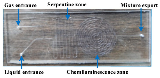 In order to fully mix the ozone with the glucose solution in the microchannel, to undergo chemiluminescence in a fixed area and to enable one to uniformly detect its produced chemiluminescence by the optomultiplier tube, we developed a microfluidic chip [25] with both a T-type and vortex structure, as shown in Figure 4. The width of all microchannels in the chip is 0.5 mm, and the depth is 0.25 mm. The liquid and gas channels adopt a T-type flow focusing structure, and the size of the elliptic long and short axes in the vortex region are 2.2 and 1.3 mm, respectively.