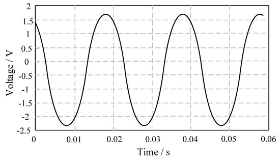 By using a vortex-type T-type structure microfluidic chip to perform ozone chemiluminescence testing, the chemiluminescence sinusoidal signal can be detected under appropriate liquid flow and gas pressure ratio conditions. We selected a specific working condition of liquid flow rate 4 mL/h and gas pressure 50 kPa, and the chemiluminescent sinusoidal voltage signal detected by the photomultiplier is shown in Figure 5.