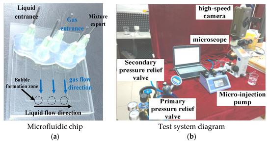 In order to explore the formation characteristics of micro-fine bubbles under T-type flow-focus, we selected polydimethylsiloxane (PDMS) as the microfluidic chip material. We developed a T-type flow-focused microfluidic chip according to the structure and distribution of the T-type flow-focused gas-liquid two-phase microchannel. The shape structure and size of the chip are shown in Figure 6a, and the test system is shown in Figure 6b.