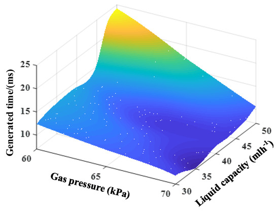 In Figure 7, when the pressure value of each liquid is fixed, the formation time of the micro-fine bubbles increases if the liquid flows with a trend of dramatic increase. Conversely, the bubble formation time all decreases with the increase in gas pressure.