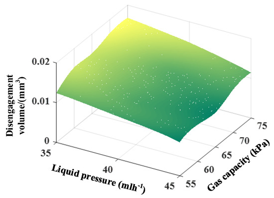 It is easy to find, by analyzing Figure 8, that when the gas pressure is constant, the bubble disengagement volume shows the trend of an approximately linear decreasing with the increase in the liquid flows. Conversely, when the liquid flows is fixed, the bubble disengagement volume increases with the increase in the gas pressure and the trend to increase is non-linear.