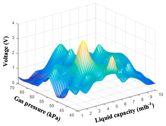 As can be seen from Table 2, for the 150 mg/L glucose solution (a set of glucose solution concentrations is used to find the best gas–liquid flow), the average peak value range of voltage signal obtained under different working conditions is between 0~4 V. The data in the Table are further graphically processed to obtain the average peak value change law curve of chemiluminescence voltage waveform signal, as shown in Figure 10.