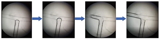 Before the ozone chemiluminescence COD detection test was carried out, the formation of ozone-base micro-fine bubbles at the T-shaped structure in the microfluidic chip was observed by the microscope. The results are shown in Figure 11.
