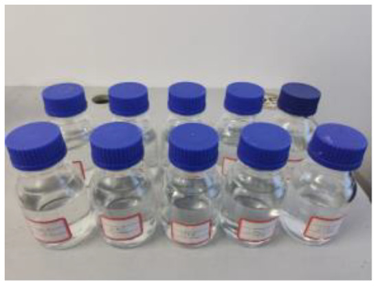According to the specifications in Table 1, 10 groups of glucose solutions with the same concentration for later use were prepared, as shown in Figure 12. Then, the ozone chemiluminescence COD detection test system was built, and 6 groups of 10 groups of solutions were selected to carry out the ozone chemiluminescence COD detection test with the optimal liquid flow rate and gas pressure.