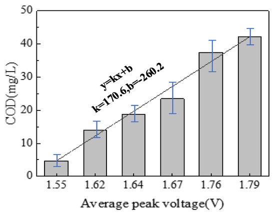 Linear fitting result of voltage average peak values and COD detection values by potassium dichromate method.