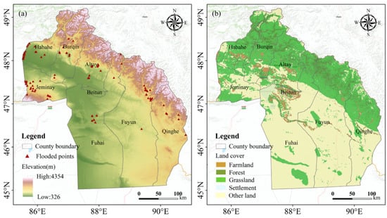 The study area: (a) the flash floods inventory map in Altay; (b) landcover types in Altay.