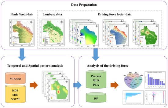 The purpose of this research is to analyze the changing patterns of historical flash floods and explore the driving factors behind flash floods in the Altay region. The primary objectives were: (1) discovering the spatial–temporal variability of flash floods based on the M-K test, kernel density estimation, standard deviational ellipse, and spatial gravity center model; and (2) analyzing the drivers of flash flooding in four land-use type subdivisions using four methods. The research results can provide scientific reference and decision support for the development of reasonable disaster prevention measures and effective flood risk management.