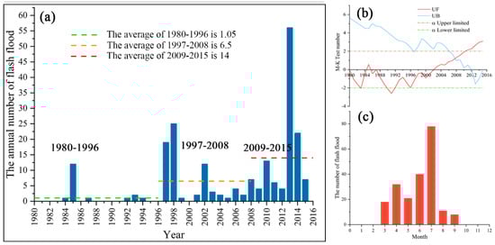 As shown in Figure 4, the variation characteristics of flash floods in the time series from 1980 to 2015 were expressed in period scale, yearly scale, and monthly scale. As shown in Figure 4b, the intersection of UF and UB occurred in 2008, indicating that 2008 was the mutation point of a flash flood. In addition, the trend of UF indicated an almost constant increase in flash floods after 1996. Thus, 1996 is also an important time point. According to the result of the M-K test in Figure 4b, the occurrence of flash floods in the yearly scale was divided into three time periods, which are 1980–1996, 1997–2008, and 2009–2015, when the number of flash floods was 18, 78, and 112. Figure 4a indicated that few flash floods occurred during the first period, except in 1995. In the second period, the number of flash floods increased, especially in 1997, 1998, and 2002. The number of flash floods in the third period continued to increase, peaking at 56 in 2013. The results of the M-K test indicated that the year 2008 is the mutation point (the intersection point of UF and UB), and it indicated that the number of flash floods steadily increased after 2008, which was consistent with the statistical results. In addition, the value of UF steadily increased after 1996, indicating that the frequency of flash floods rose after 1996. Figure 4c shows that the most flash floods occurred in July, accounting for 37.5%. April and June also had many flash flood records. No flash floods occurred in January, February, October, November, and December.