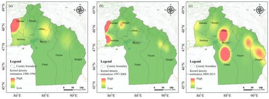 The kernel density analysis results are presented in Figure 5. In the 1980–1996 period, Habahe (13 flash floods) was the area with the most frequent occurrence of flash floods. Altay City had two flash floods, and other districts had very few flash floods (Figure 5a). In the period from 1997–2008, the high frequency of flash floods was concentrated in Habahe (44 flash floods) and Jeminay (12 flash floods), and Burqin had 5 flash floods. In addition, the frequency of flash floods has increased significantly in the period from 2007 to 2015. The number of flash floods in Habahe (9 flash floods) and Jeminay (11 flash floods) decreased. A high frequency of flash floods occurred in Altay City (24 points) and Fuhai (30 points). Fuyun (14 points) and Qinghe (22 points) showed an increase (Figure 5c). In general, the area with a high incidence of flash floods was concentrated early on in Habahe and more recently in Altay City.