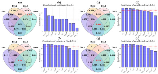 Results of interaction and contribution rate of mountain flash flood influencing factors based on the collaborative analysis of PCA and MLR in different land cover subregions. (a) The adjusted R-squared value of MLR of corresponding principal components to the kernel density in farmland. (b) The contribution of driving factors to Dim.3 and Dim.4 in farmland. (c–h) Corresponding to forest, grassland, and settlement land cover regions, respectively.