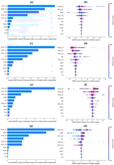 The mean SHAP value of each feature and the SHAP value of each test sample in different land cover subregions. (a) The sequence that importance of each feature for flash flood kernel density in the farmland. (b) The distribution of the SHAP value of each test sample with each feature in the farmland. (c–h) Corresponding to forest, grassland, and settlement land cover regions, respectively.