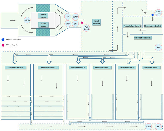 The treatment plant is equipped with online pH, TSS, conductivity, ORP, level, and flow sensors that relay real-time information to a SCADA system provided by GUARD Automation (https://guard.no/) assessed on 15 December 2021. A multi-parameter-based dosing control system [13], provided by DOSCON, ensures an optimal dosing of coagulant and polymer in the treatment plant. The layout of the treatment process, the location of online sensors, dosing points for coagulants and flocculants, and the flow distribution of wastewater along the WWTP are presented in Figure 1.