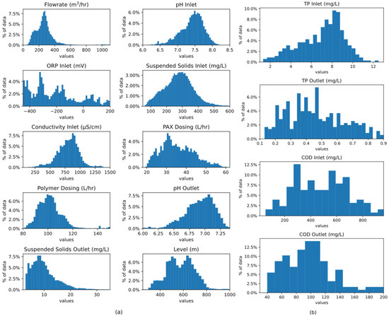 In addition to the online sensors located in several sections of the WWTP, auto-samplers are installed at raw and treated wastewater sampling points to collect composite samples. The auto-samplers are programmed to collect 50 mL samples when the cumulative wastewater flow reaches 200 m3. The composite samples are then analyzed for TP and COD using standardized methods as described in [3]. TP is analyzed as a daily average (from 8:00 a.m. of every working day to 7:00 a.m. of the next working day) and COD is analyzed once every week as weekly averages (on Fridays). The mean and standard deviation of the influent and effluent TPI and COD along with the removal rates are presented in Table 1. The distribution of data obtained from online sensors (pH, TSS, Flowrate, conductivity, ORP, PAX and Polymer dose flow-meters) and the values measured using standardized lab measurements (TP and COD) for the year 2020–2021 are presented in Figure 2a,b. The x-axis shows the range of the data used to calibrate the soft-sensor, and the y-axis shows the percentage of data corresponding to the value presented in the x-axis.