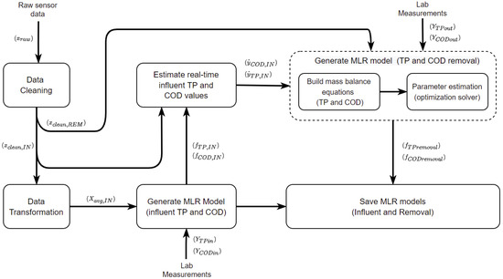 The steps involved in the processing of online sensor data and development of mathematical models for estimating TP and COD in the influent and effluent are presented in Figure 3.