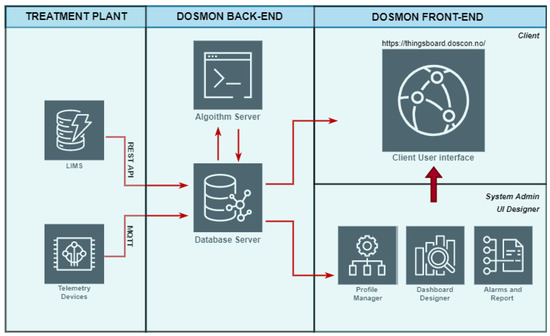 The backend of DOSMON core mainly consists of two servers. The primary server is used for the acquisition and storage of data from the IoT devices and Lab Information Management System (LIMS) software (database server), while the secondary server is used for running the soft sensor algorithms (algorithm server). The communication and data exchange between algorithm and data server is established using DOSMON’s REST API. The algorithm server pulls the raw sensor telemetry from the data server and pushes algorithm results back to the data server. The software architecture presented in Figure 4 allows us to have reliable and robust IoT communication and dedicated computing power for executing soft sensor algorithms. The IIoT architecture also allows us to manage changes in the algorithms and tune model parameters a minimal downtime at the plan.