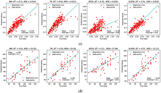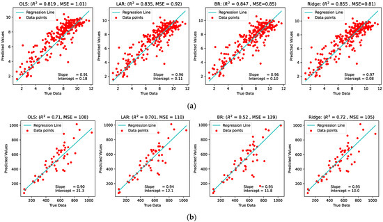 Real-time data from the online sensors were obtained from the treatment plant’s SCADA system and lab-measured values of TP and COD were obtained from LIMS software. Online and lab-measured data for a period of 12 months (from 10 April 2020 to 10 April 2021) are used to calibrate the model and obtain the MLR model coefficients. The results of model calibration showing a comparison between the model predicted and lab- measured values are presented in Figure 5. The plots also show the mean-square error (MSE) and the Pearson correlation coefficient () for the models calibrated using the four different calibration algorithms mentioned in Section 2.4. The slope and intercept of the regression line are also presented in the Figure 2 plots. The scatter plot of a perfect prediction model would be a 45-degree line with a slope = 1 and intercept = 0 and an value of 1. A quantitative assessment of different prediction models is conducted by comparing the values of and regression line equations.