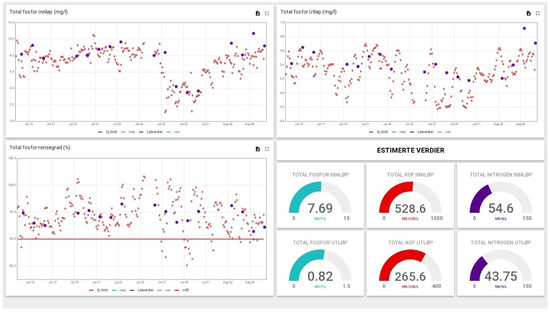 GUI dashboard presenting estimated values of TP influent and effluent along with lab- measured values for a period.
