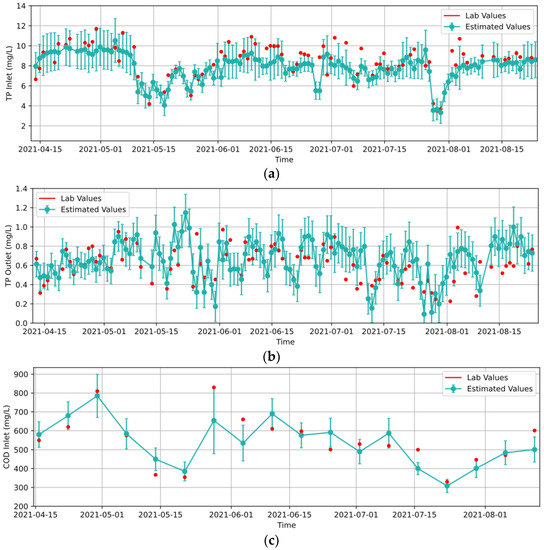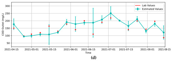 The soft sensor estimations of the influent and effluent TP/COD were monitored for four months (from 15 April 2021 to 18 August 2021). A comparison between the values estimated by the soft sensor along with the prediction error (calculated according to the method described in [31]) and the lab-measured values are presented in Figure 7.