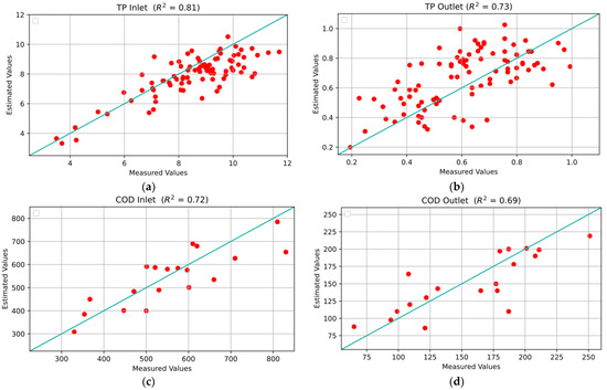 Regression plots for (a) influent TP, (b) effluent TP (c) influent COD, (d) effluent COD.