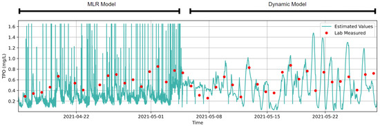 The soft sensor development workflow, presented in Section 2.3, shows a difference between the approaches used to develop influent and effluent estimation models. While a conventional MLR model correlating the TP/COD values to their corresponding online sensor data was used for influent wastewater quality parameters, a dynamic model was used for the effluent wastewater quality parameters. A few case studies presenting the estimation of effluent wastewater quality parameters using data-driven soft sensors are found in the literature [32,33,34]. These case studies show that it is possible to develop a statistically significant correlation between effluent TP/COD and their corresponding online sensor data. Correlation coefficients of = 0.72 and MSE = 0.013 for effluent TP and = 0.62 and MSE = 15.5 for effluent COD were obtained when the daily/weekly averaged values of flowrate, effluent suspended solids effluent, PAX/Polymer dosage, and pH (after dosing) were correlated to the lab-measured effluent TP and COD values. However, several issues were encountered while deploying the effluent MLR models in the algorithm servers for real-time estimations. The estimation error was particularly visible for effluent TP, where the soft sensors estimated values that were mechanistically impossible to attain. The estimated values frequently showed as negative effluent TP values or effluent TP being higher than influent TP. The frequent extremities of the estimated TP and COD values can be dealt with by implementing an averaging filter, by imposing min-max limits, or by integrating conditional loops limiting the TPO to always be below TPI estimates. However, these constraints failed to achieve a general smoothness in the TP and COD estimations in the effluent. A comparison between the effluent TP estimated by the conventional MLR model versus the dynamic model is presented in Figure 9.