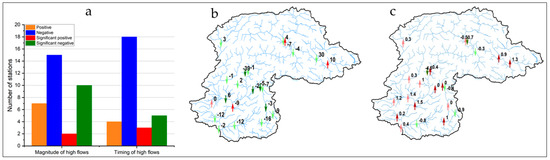 Trends detected by Mann–Kendal and trend values estimated by Sen’s method in (a) number of stations showing positive, negative and significant trends; (b) magnitude of high flows (value is given in% of the data period average decade−1) and (c) timing of high flows (upward and downward arrow shows positive and negative trends, respectively; bold arrow shows significant trends at α = 0.05).