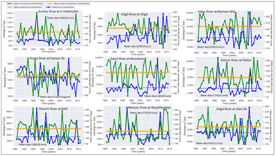 The northern rivers of UIB are more sensitive towards the temporal changes rather than the spatial changes. The peak flow appears between June and August as shown in Table 1. Particularly, the peaks in glacier dominant basins appear in August as compared to the snow dominant basin where it occurs in the beginning of June [28,46,47]. Most changes in peak timing with significant trends occurred from late 1981 to 2016. The decreases in the timing of annual high flows were found in 18 (5 significant) stations while the timing increased in 4 (3 significant) stations for the period 1981–2016 as shown in Figure 3a. Only four rivers/sub-basins (Shyok, Hunza, Bara and Haro) of UIB exhibited an increasing trend in flows. The frequencies of annual high flows in the Jhelum River basin at Mangle dam and its tributaries (Kunhar, Neelum, Poonch and Kanshi Rivers) increased, however, significant trends were restricted to Kunhar and Jhelum rivers as shown in Figure 3c.
