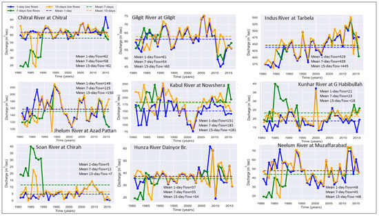 Trends in low flows at different time scale, i.e., 1-day, 7-day and 15-day in annual and seasonal time series for 35 stations were investigated for the period of 1981–2016. These trends were detected by applying the same MK test at the significance level of 90%, 95%, 99% and 99.99%. The trend value (change vale) in these time series was estimated through the Sen’s slope method. After filtering the present data, 35 different stations were marked, upon which analysis was performed. The time series analysis of major rivers having low flows is given in Figure 5. The highest low and lowest low flows were exhibited at the Indus and Soan Rivers, respectively. The mean low flow at Daniyor Bridge in the Hunza River falls to 34 m3/s in 15 consecutive days, remaining with 1400 m3/s as mean maximum in the ablation season. Similarly, the low flow at Indus at Tarbella could have a 15-day low flow means of 445 m3/s, reaching a highest flow mean in summer of 10,700 m3/s. Generally, a slightly increasing trend was observed in low flows at most of the gauges for all three extremes. Spatial maps were developed, and the geographical location of different stream gauges with increasing or decreasing trends are shown in various figures.