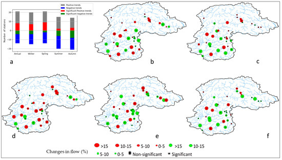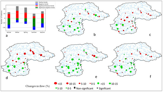 Spatio-temporal distribution of 15-day low flow trends of UIB: (a) number of stream gauges with positive, negative and significant trends (b) annual; (c) winter; (d) spring; (e) summer and (f) autumn. Red and green circles indicate increasing and decreasing flows, respectively.