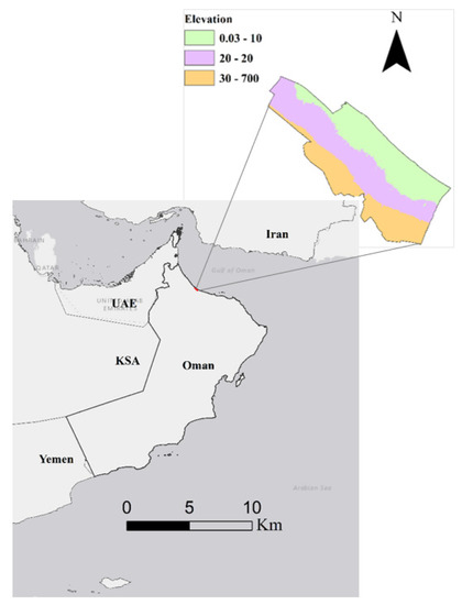 Al Batinah Plain features a large density population and cultivated land in the country [31]. Al Batinah Plain is the second most populated area in Oman after the capital Muscat. The plain has experienced rapid population expansion and developmental activities, such as concentrated urbanization, water desalination, power production plants, harbors, refinery, venues for coastal tourism, ports, infrastructure development, agricultural development, and industrial facilities [44].