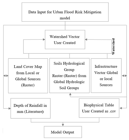 The urban flood risk mitigation model inputs (Figure 4) were as follows: