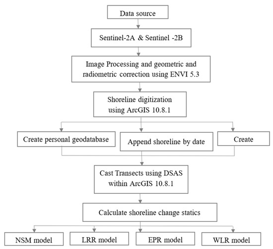 Coastal change rate: This study obtained three scenes from SENTINEL-2A and SENTINEL-2B images from the Earth Explorer website (http://www.earthexplorer.usgs.gov (accessed on 16 October 2021) for the study timeframe (Table 2). The images were geometrically and radiometrically corrected to UTM zone 40 using ArcGIS 10.8.1 and ENVI 5.3 software.