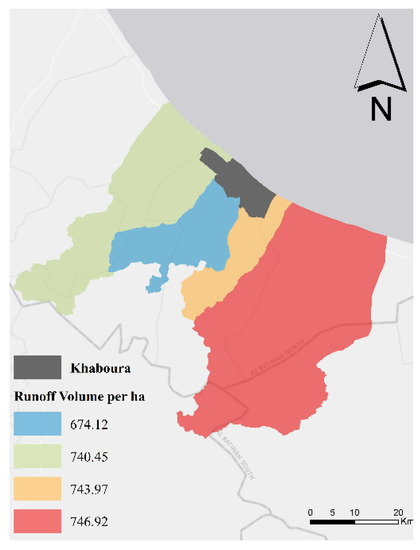 A spatial distribution of the runoff volume (m3), calculated per area (ha) for the four watersheds at the 121.1 mm rainfall intensity, is shown in Figure 8. The red color shows the largest amount of runoff per ha, while the blue color shows the lowest amount of runoff per ha. By observing the spatial distribution of the runoff volume per hectare for the four watersheds and others, it is obvious how this relative index highlights the non-functioning situation, especially for the Wadi Al Hawasinah watershed.
