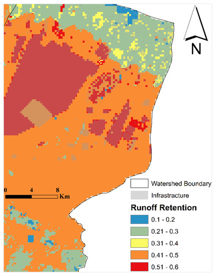 In this study area, the runoff retention index ranged from 0 (low retention) to 0.6 (high retention) and was overlayed to the building footprint. The urban district with residential, governmental, and commercial activities showed values of 0.6% of runoff retention capacity, while some industrial sites showed a low retention capacity.