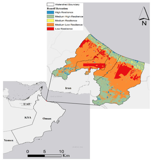 The Al Khaboura case and the amount of damage associated with the Shaheen cyclone is a good example of poor urban planning and topographical factors that led to the flooding damage. The runoff retention map in Figure 10 shows that the upstream area has a low resiliency, in addition to the availability of dams that overtopped during Shaheen, which created a high destruction to the area. The city planner could improve their urban planning practices and learn a lesson from Shaheen’s aftermath to avoid future consequences for this city and other cities in Oman.
