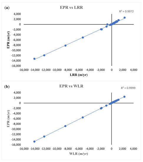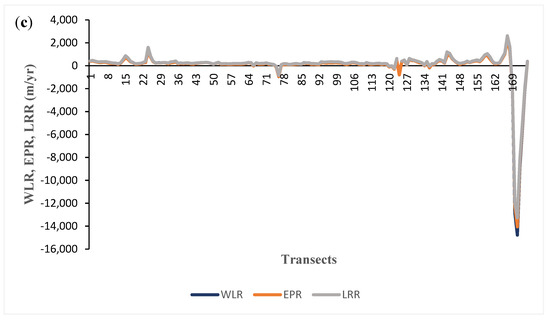 (a) EPR–LRR and (b) EPR–WLR comparison for the shoreline change rate for all transects of Al Khaboura shoreline; (c) values of EPR, LRR, and WLR (m/year) of the study for Shaheen cyclonic event.